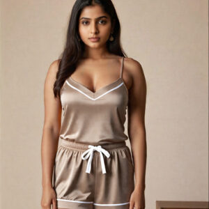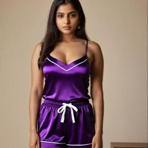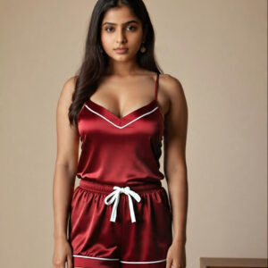 Slip into comfort and style with this Luxe Black Satin Nightwear Set, designed for the modern woman who values elegance even in her downtime. Made with buttery-smooth satin, this co-ord set includes a V-neck spaghetti strap top and matching elasticated shorts, both detailed with classy white piping for that extra refined look.